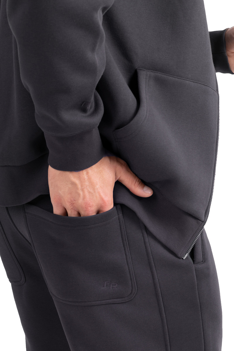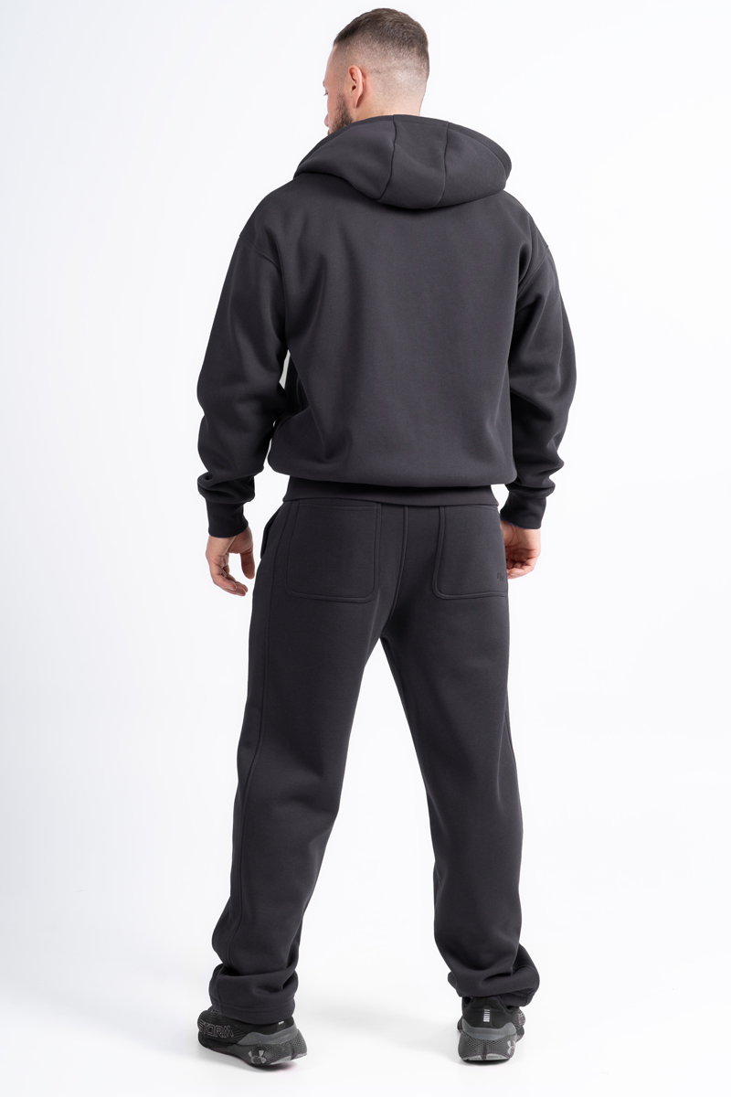 Куртка на блискавці з капюшоном та кишенями поєднується зі штанами на високій посадці, доповненими манжетами та утяжками. Універсальний сірий відтінок робить костюм гармонійним елементом будь-якого чоловічого гардеробу від спортивного до повсякденного.