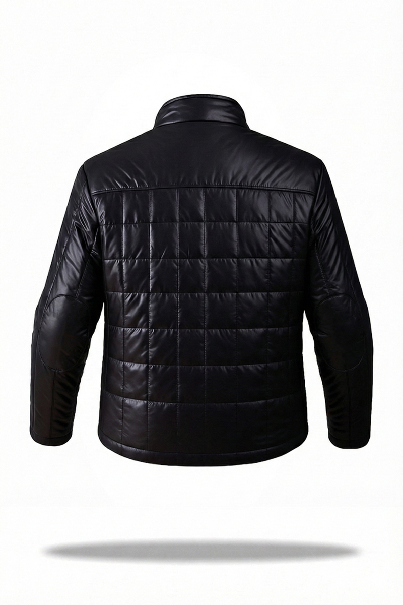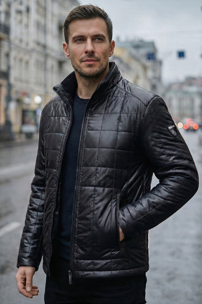 Куртка оснащена блискавкою, двома зовнішніми і двома внутрішніми кишенями, а також регульованими манжетами на рукавах. Класичний чорний колір і стьобана текстура надають образу елегантність і практичність.