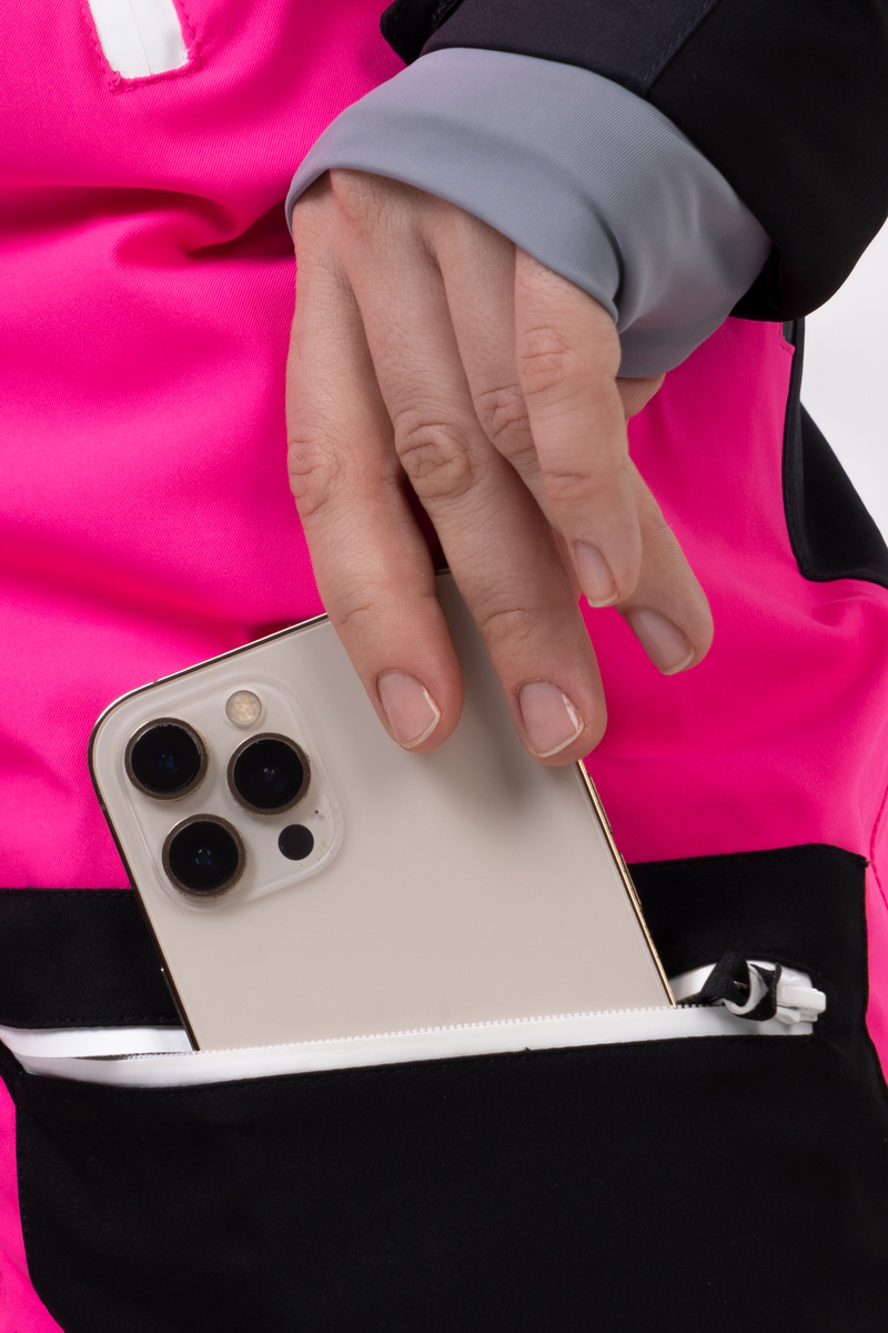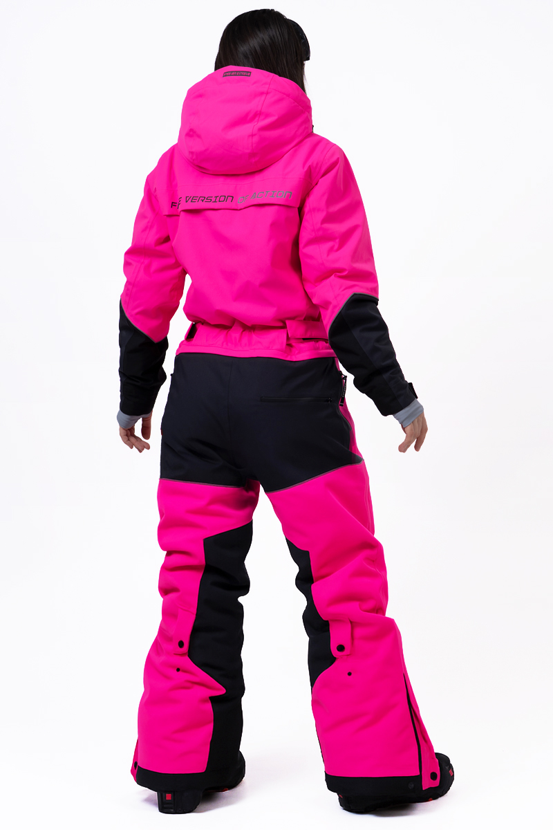 Комбінезон оснащений водонепроникними блискавками, проклеєними швами, вентиляційними отворами та внутрішніми манжетами, що робить його надійним захистом від вітру та вологи. Яскраво-рожевий колір та контрастні чорні вставки надають образу динамічності та виділяють на тлі засніжених схилів.