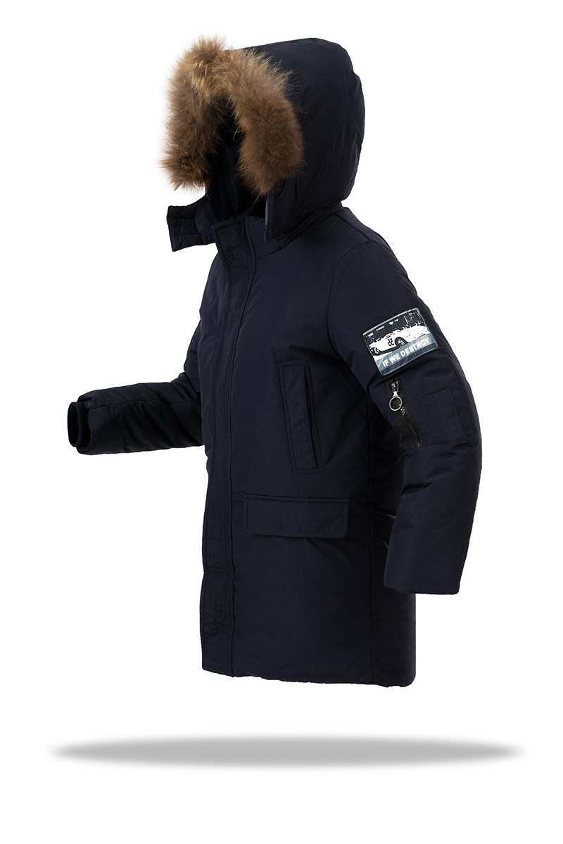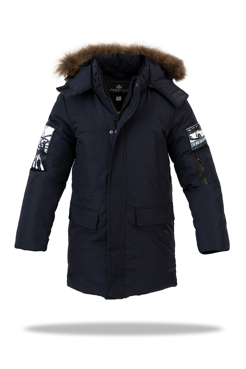 Парка дитяча Freever GF 4206 темно-синя. Комфортна довжина, зручний прямий фасон, що не перешкоджає свободі рухів і всі необхідні функціональні деталі, що підвищують комфорт використання, роблять цю куртку незамінним атрибутом для холодного сезону року. Парка зшита зі щільного поліестеру. Матеріал добре захищає від вітру, відрізняється високою міцністю і стійкістю до зносу. Спеціальна обробка поверхні відштовхує бруд і воду. Підкладка на штучному наповнювачі Холофайбері добре зберігає тепло тіла, навіть в -20 ° С. Застібається на центральну блискавку з одним бігунком, яка прикрита вітрозахисною планкою. Є високий воріт-стійка, внутрішні еластичні манжети й знімний капюшон зі штучним хутром. Глибина капюшона регулюється затяжками на фіксаторах. Усередині куртки є одна нагрудна кишеня, зовні — п’ять, у тому числі: дві нагрудних на блискавках, дві з боків на клапанах і одна на рукаві на блискавці.