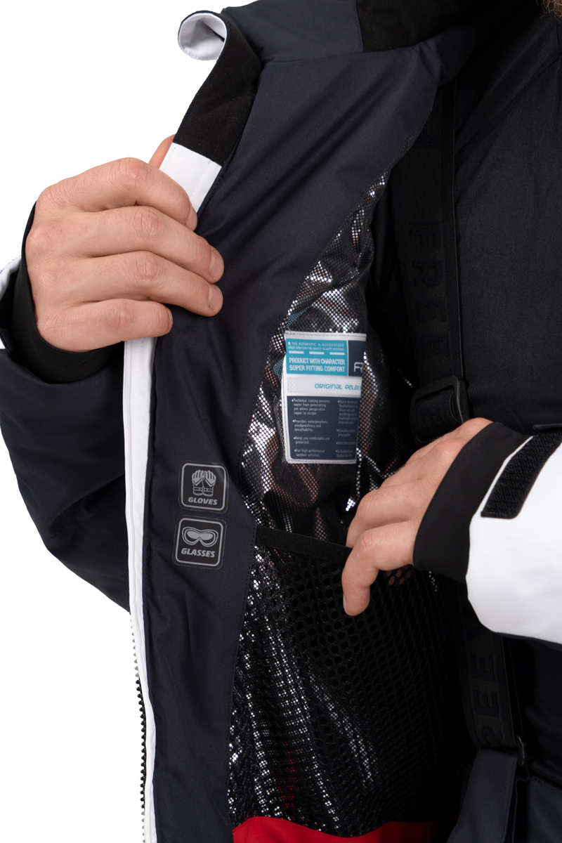 Модель оснащена съемным капюшоном с утяжкой, дополнительной вентиляцией для контроля температуры и центральной застежкой на молнии с двумя бегунками, дополненной кнопками и магнитом. Функциональность куртки усиливает увеличенное количество карманов — шесть внешних и два внутренних, что делает ее практичным выбором для горнолыжного спорта и активного зимнего отдыха.