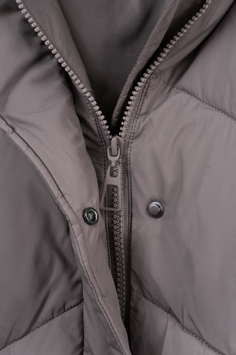 Прямой крой длиной до колен, несъемный капюшон и внутренняя защита от ветра делают пальто удобным и функциональным. Застежка на двухзамковую молнию с кнопками, внутренние манжеты и практичные карманы обеспечивают дополнительный комфорт.