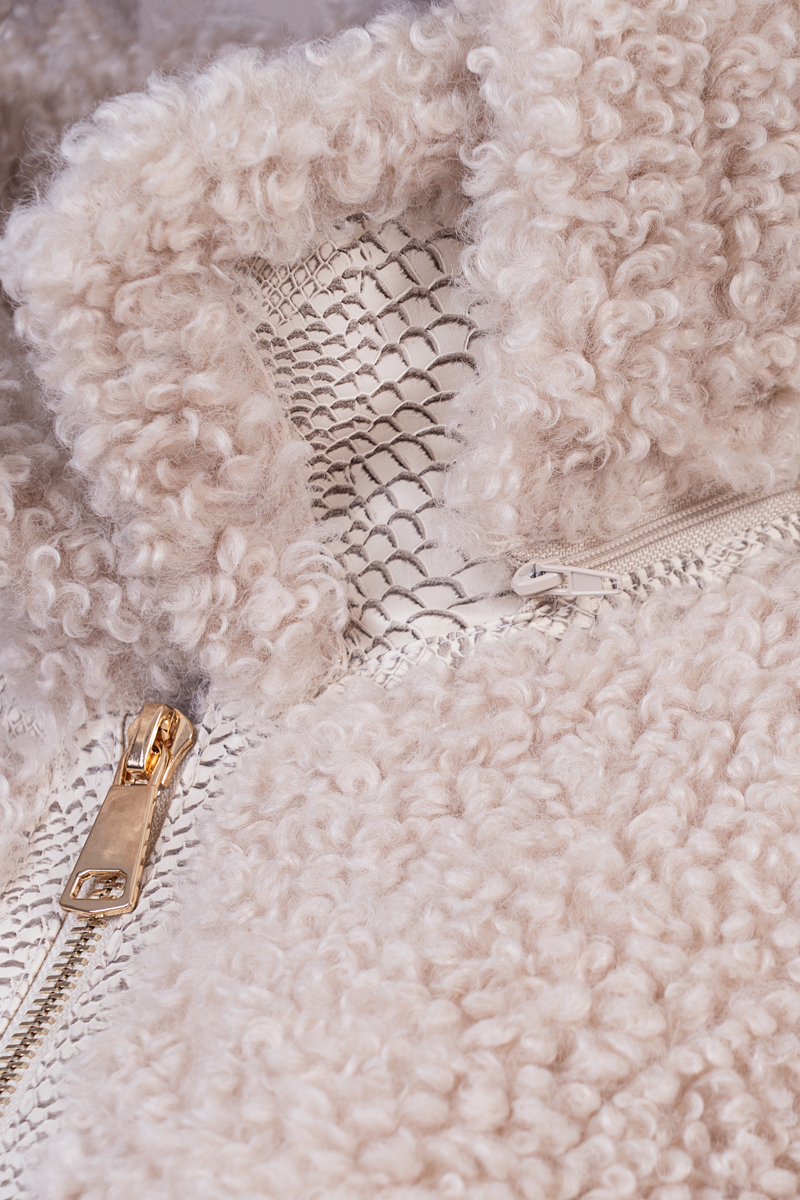 Подкладка из полиэстера и утеплитель обеспечивают комфорт в температурном диапазоне от –5°C до +10°C. Съемный капюшон позволяет легко менять стиль, а манжеты на рукавах надежно защищают от ветра. Полушубок удачно сочетает в себе уют, тепло и универсальность.
