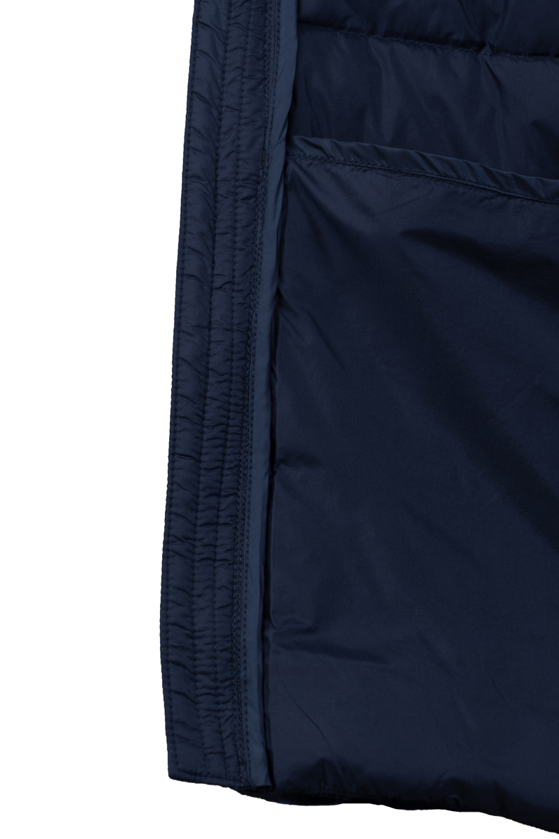 Пуховик оснащен молнией с одним бегунком и внутренними манжетами, которые помогают удерживать тепло. Отсутствие капюшона подчеркивает сдержанный дизайн модели. Функциональность дополняют два внешних и два внутренних кармана, удобные для хранения необходимых мелочей.