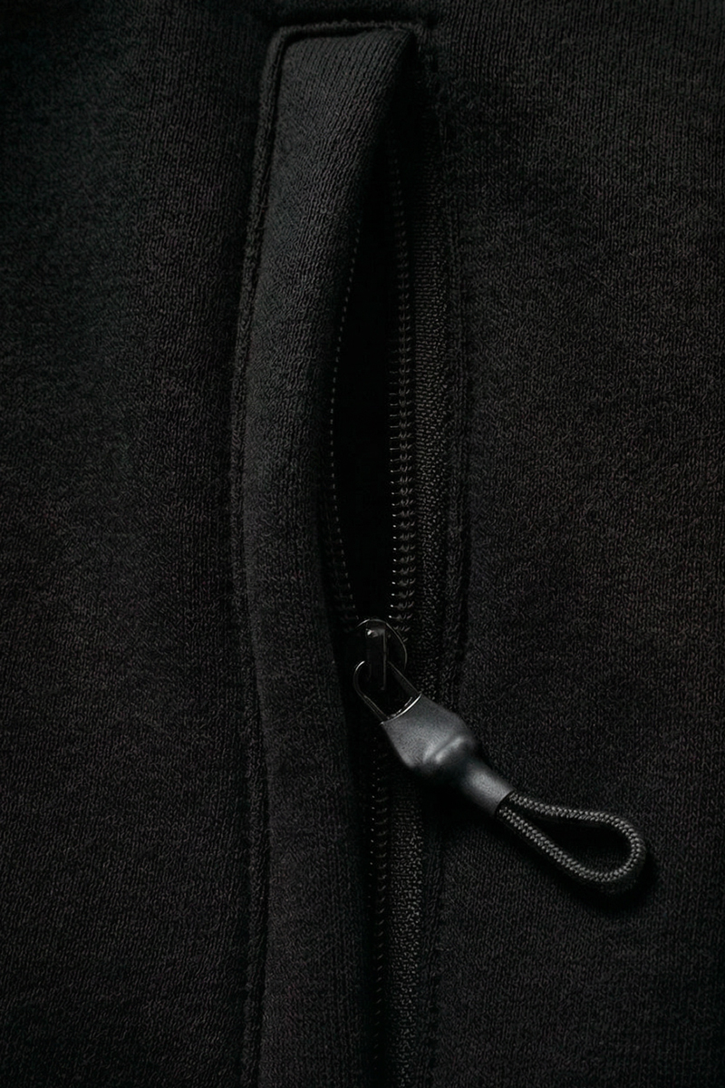 Кофта оснащена капюшоном для дополнительной защиты от ветра и холода. Застежка на молнии повышает удобство в использовании, а два внешних кармана позволяют практично разместить необходимые вещи. Модель сочетает функциональность и сдержанный спортивный стиль.