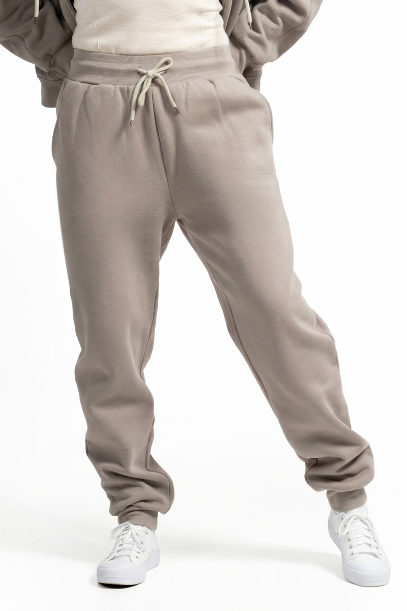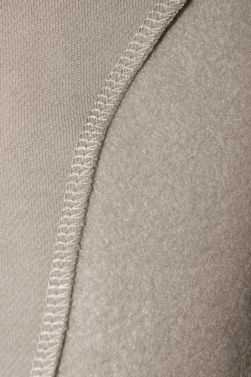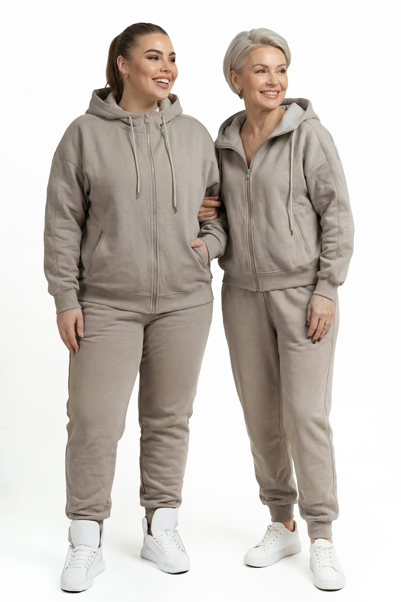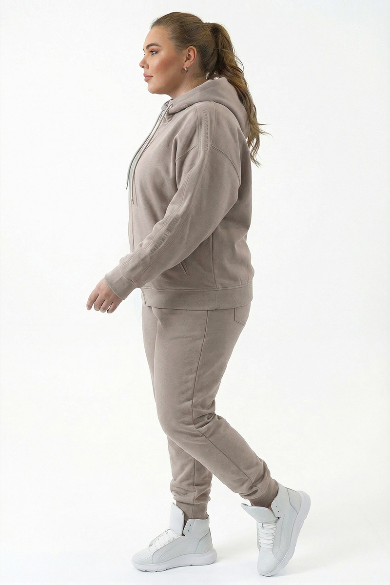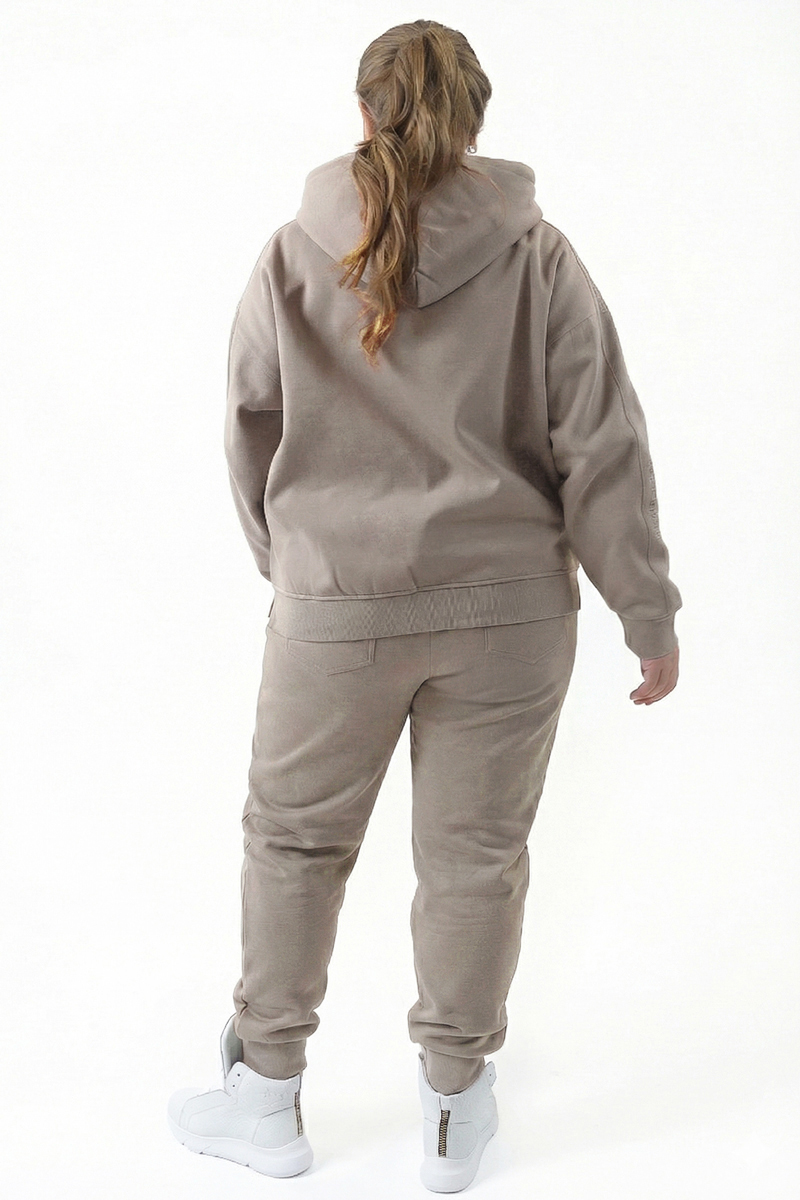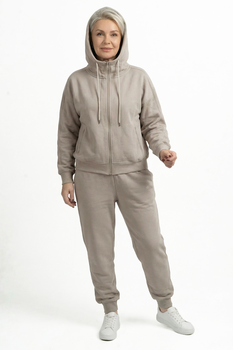 Куртка з капюшоном оснащена блискавкою та має зовнішні кишені для зручного зберігання дрібних речей. Штани з високою посадкою та фасоном під резинку забезпечують комфортну фіксацію та свободу рухів, доповнені чотирма зовнішніми кишенями. Бежевий колір додає універсальності образу, дозволяючи легко поєднувати костюм з іншим одягом у спортивному або casual стилі.