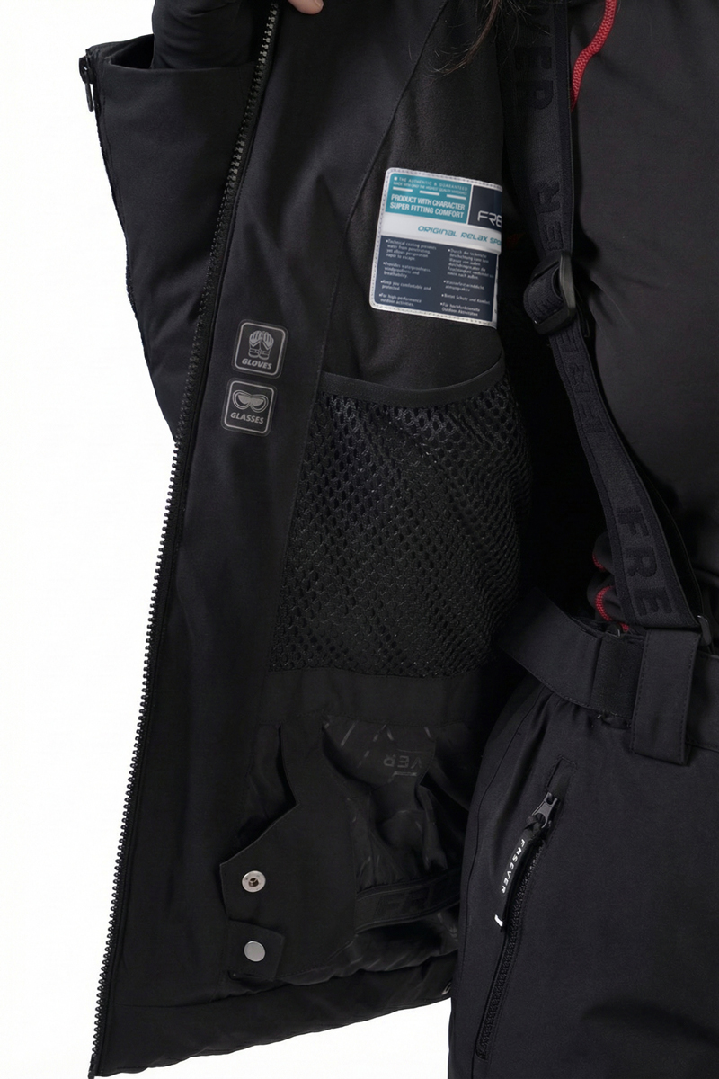Модель оснащена утяжками з фіксатором на капюшоні та по низу куртки, а також продуманою системою кишень: два внутрішні та три зовнішні відділення забезпечують зручне розміщення всіх необхідних речей. Freever NF 21630 — це технічна чорна гірськолижна куртка, створена для стабільного комфорту та захисту у горах.