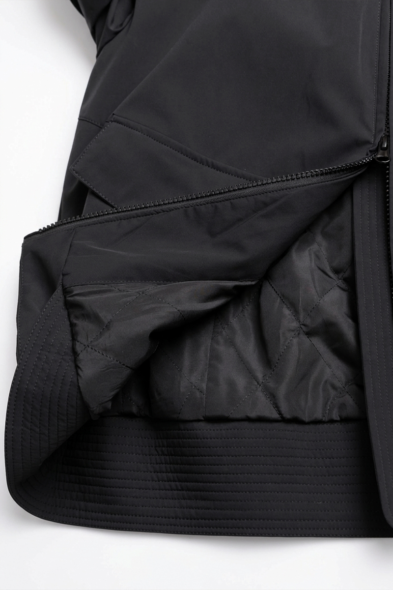 Куртка оснащена знімним капюшоном, який дозволяє змінювати вигляд моделі та адаптувати її до різних погодних умов. Центральна блискавка з двома бігунками забезпечує зручність у використанні та свободу рухів. Для практичності передбачено три кишені: дві зовнішні для швидкого доступу до необхідних речей і одну внутрішню для зберігання дрібних предметів.