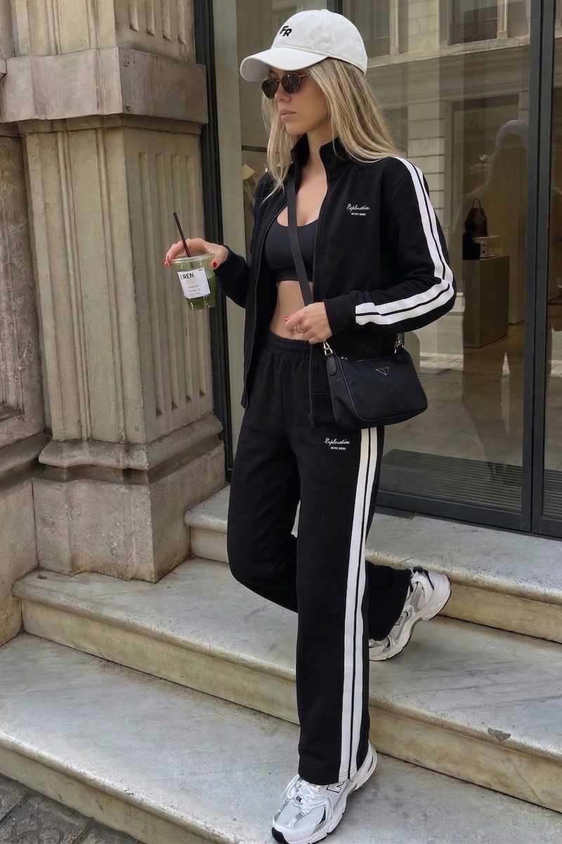 Куртка оснащена застібкою-блискавкою та двома зовнішніми кишенями для практичного використання, без капюшона та манжетів. Штани з високою посадкою також мають дві зовнішні кишені, що підвищує функціональність комплекту. Відсутність манжетів формує більш вільний силует, зручний для повсякденного носіння.